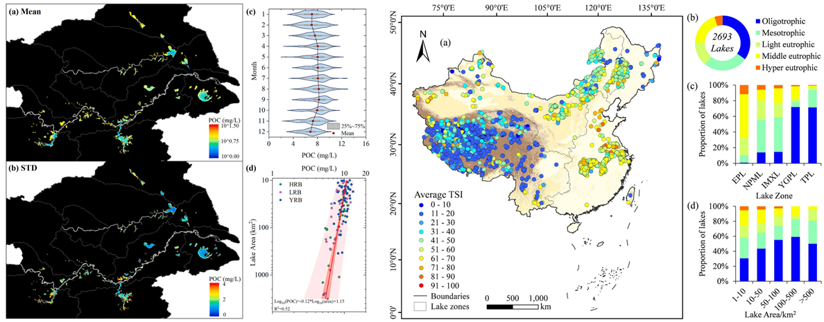 (2)基于全国422个湖泊近8000余站点的现场观测资料和多源卫星星座,重构了全国24,366个湖泊(> 0.01 平方千米)的溶解有机碳(DOC)、颗粒有机碳(POC)和溶解无机碳(DIC)浓度和储量的时空数据集,发现1984-2024年全国湖泊DOC储量增加45%,POC储量增加34%,DIC储量增加36% (Liu et al., Nature Communications, 2024; Yan et al., Scientific Data, 2025)。