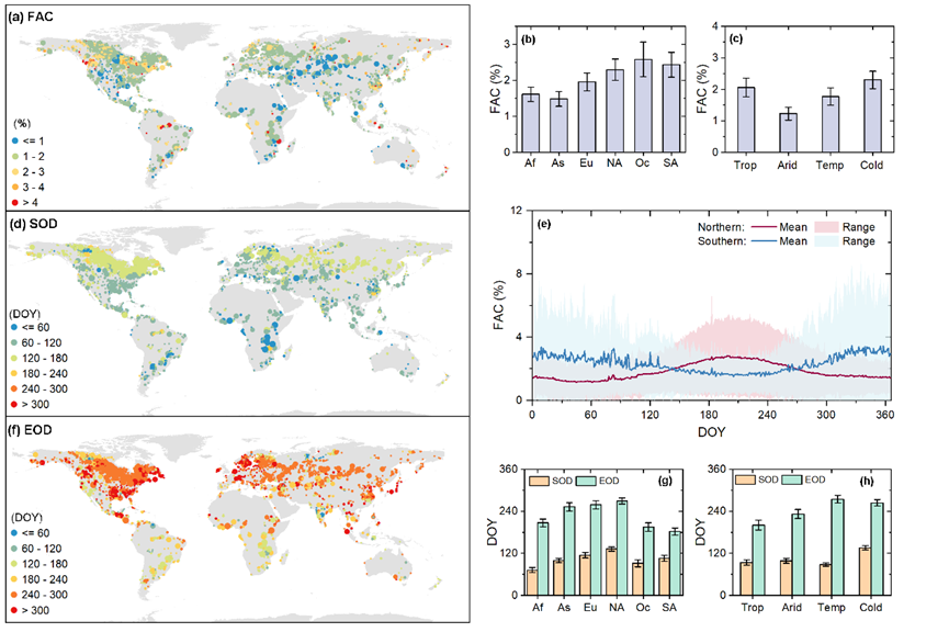 该研究利用2003—2022年中分辨率成像光谱仪(MODIS)卫星观测数据,结合研究团队前期发展的表层漂浮藻华覆盖度(FAC)反演方法,对全球4085个面积大于20平方千米的湖泊开展了长时间序列分析,并提取了藻华开始时间(SOD)和结束时间(EOD)等关键物候指标。