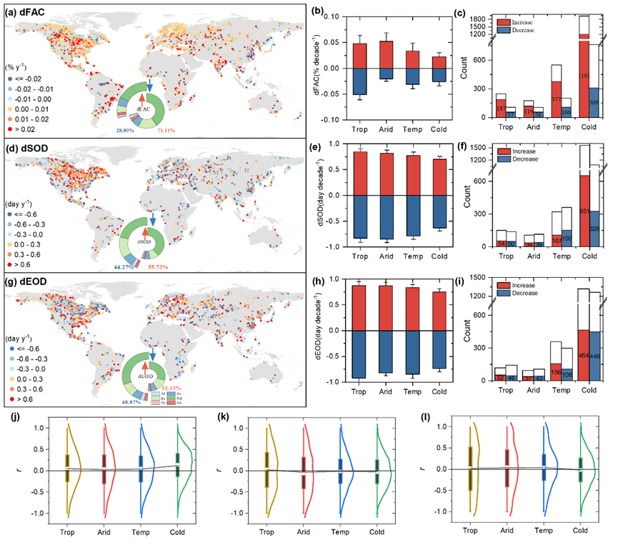 进一步分析发现,藻华强度与藻华时间并不总是同步变化,而是在全球尺度上呈现出明显的“脱耦”特征。与强度普遍增强不同,藻华开始和结束时间在空间上表现出显著差异:约55.73%的湖泊SOD推迟,44.27%的湖泊SOD提前;EOD则同样表现出增加与减少并存的格局。这意味着,湖泊藻华并不是简单地朝着“越来越强、越来越早、越来越晚结束”的单一方向变化,而是在不同区域呈现出更复杂的响应模式。