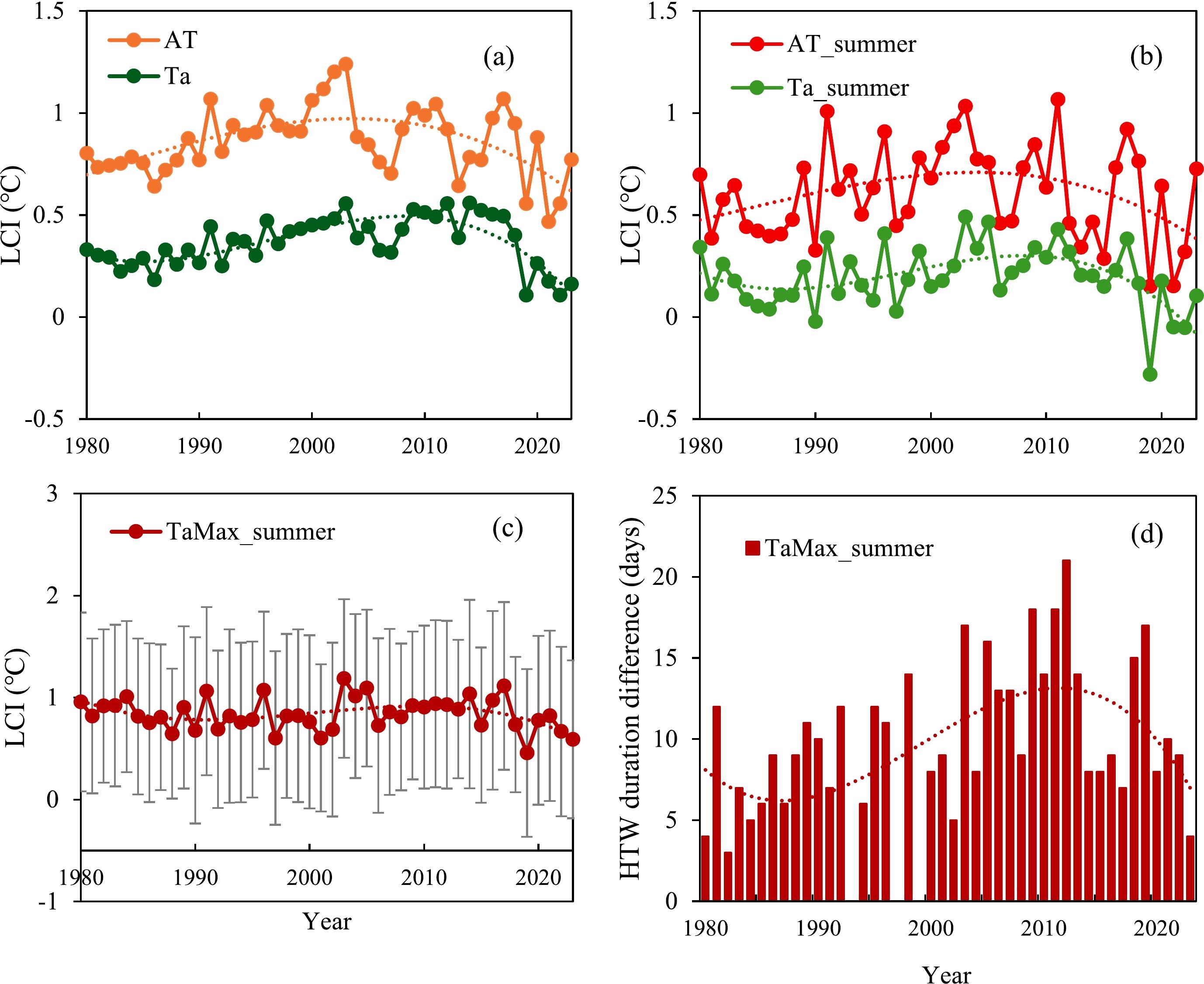 图1. 1980–2023年湖泊降温强度(LCI)变化,(a)年尺度,(b)夏季,(c)日最高气温及(d)湖-陆高温热浪天数差。图中Ta为气温,AT为体感温度。