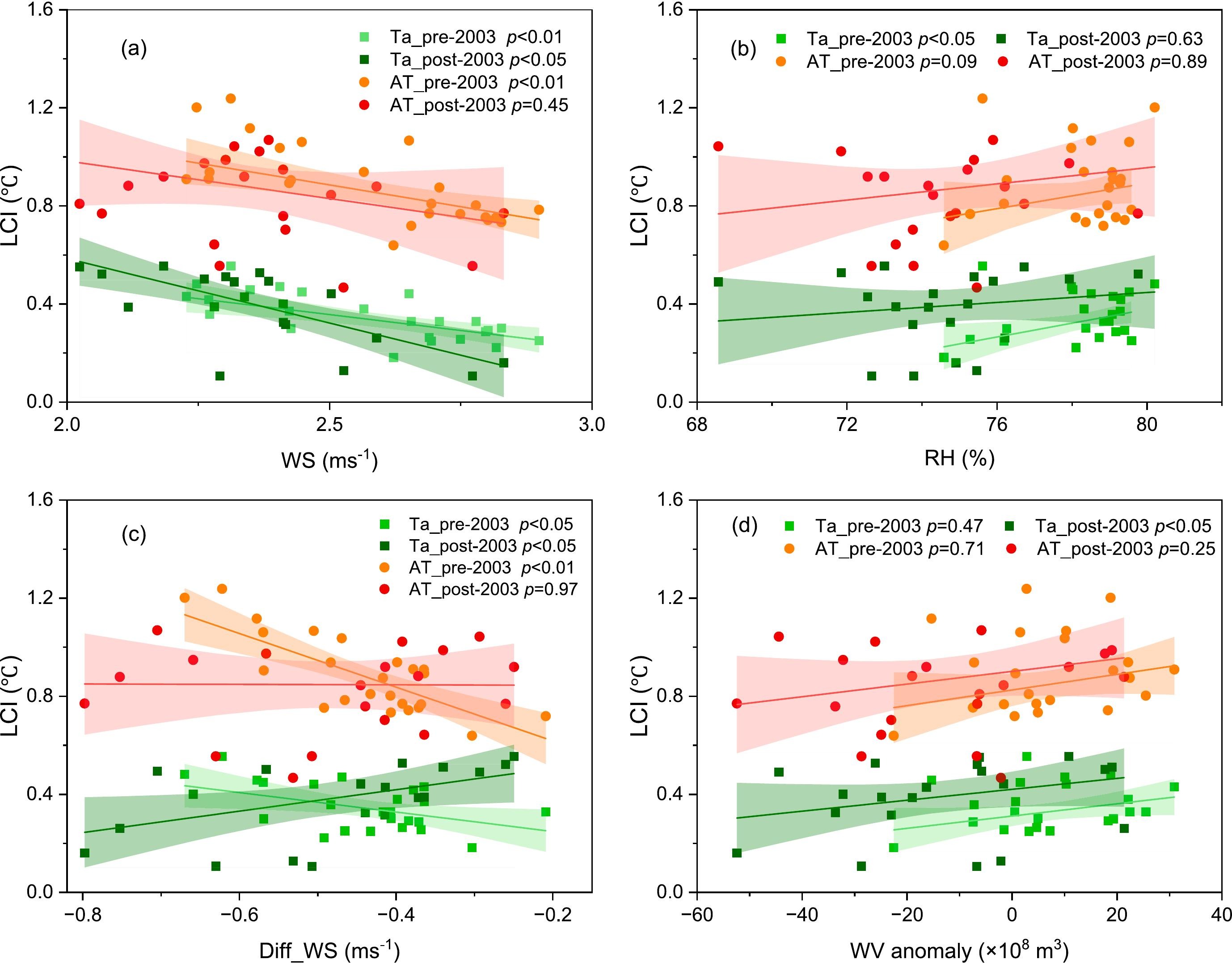 图2. 2003年前后湖泊降温强度与(a)风速、(b)相对湿度、(c)陆地-湖泊风速差及(d)湖泊水量距平的相关性
