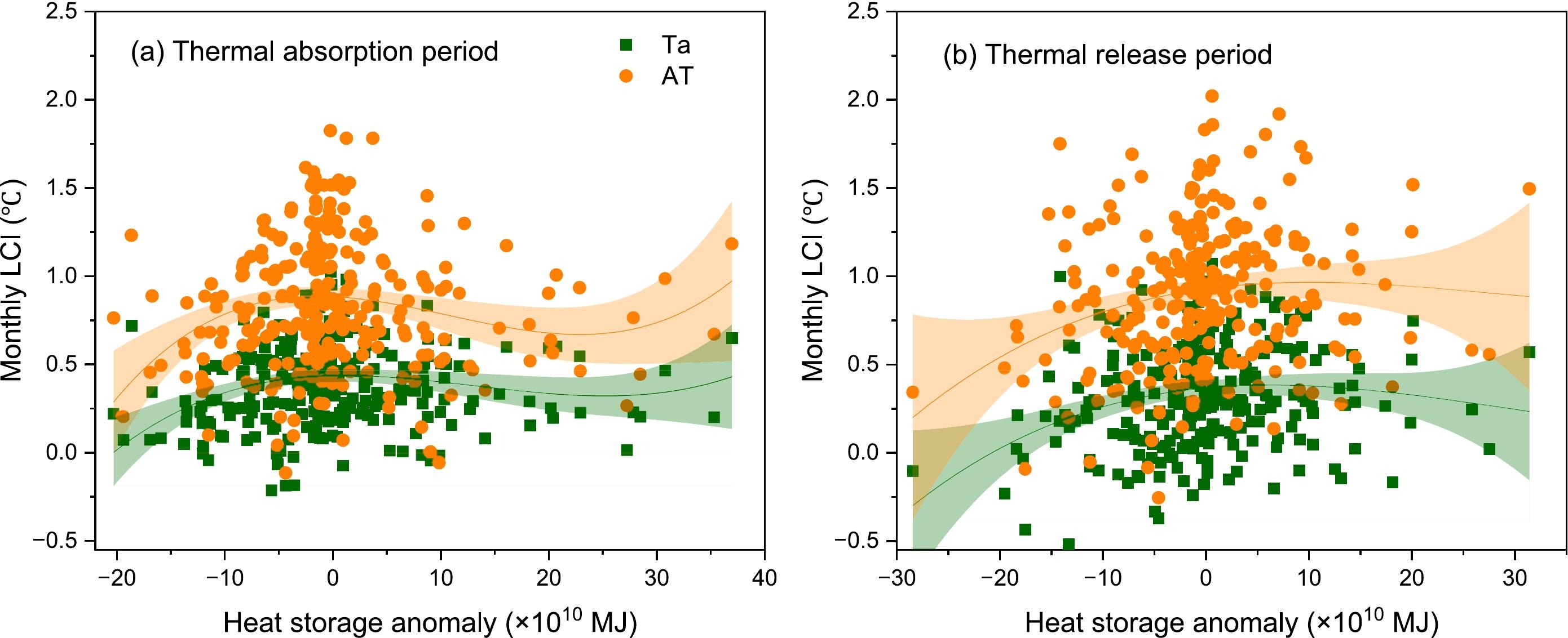 图3. 热储存期(2月–7月)和热释放期(8月–次年1月)湖泊水储热异常与降温强度之间的关系