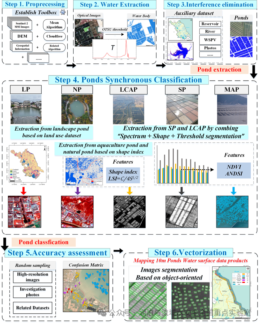 针对上述科学问题,中国科学院南京地理与湖泊研究所湖泊与流域水安全全国重点实验室林晨研究员课题组开展了系统研究,构建了适用于海岸带区域的多功能坑塘水面分类体系,涵盖陆域养殖坑塘、海域养殖水面、盐田、天然坑塘及景观坑塘等五种类型。基于多源遥感特征与面向对象的分层分类方法(图1),实现了江苏省海岸带10米分辨率的多功能坑塘水面空间分布制图,并系统揭示了“功能类型—遥感特征—地理格局”之间的耦合关系。