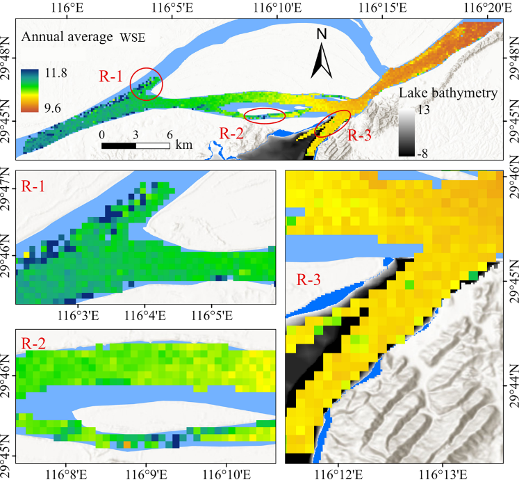 近日,中国科学院南京地理与湖泊研究所宋春桥研究员团队联合南方科技大学,利用新一代地表水和海洋地形(SWOT)卫星观测数据,首次在二维空间尺度上精细刻画了鄱阳湖-长江系统的水面高程场,揭示了江湖水文交互中显著的季节性“比降反转”与“顶托延伸”现象。