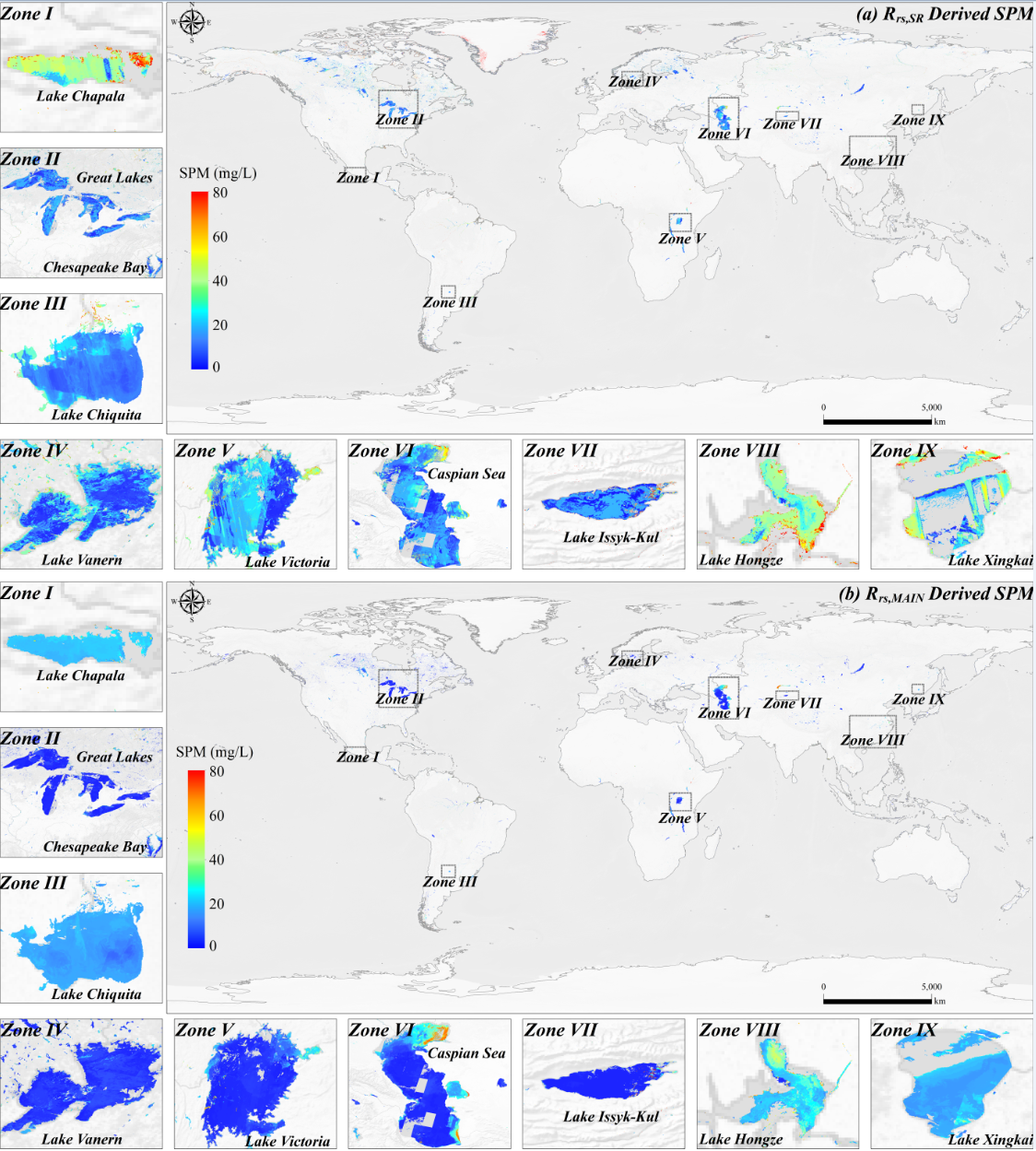 (b)在全球水体悬浮物浓度反演上的空间差异