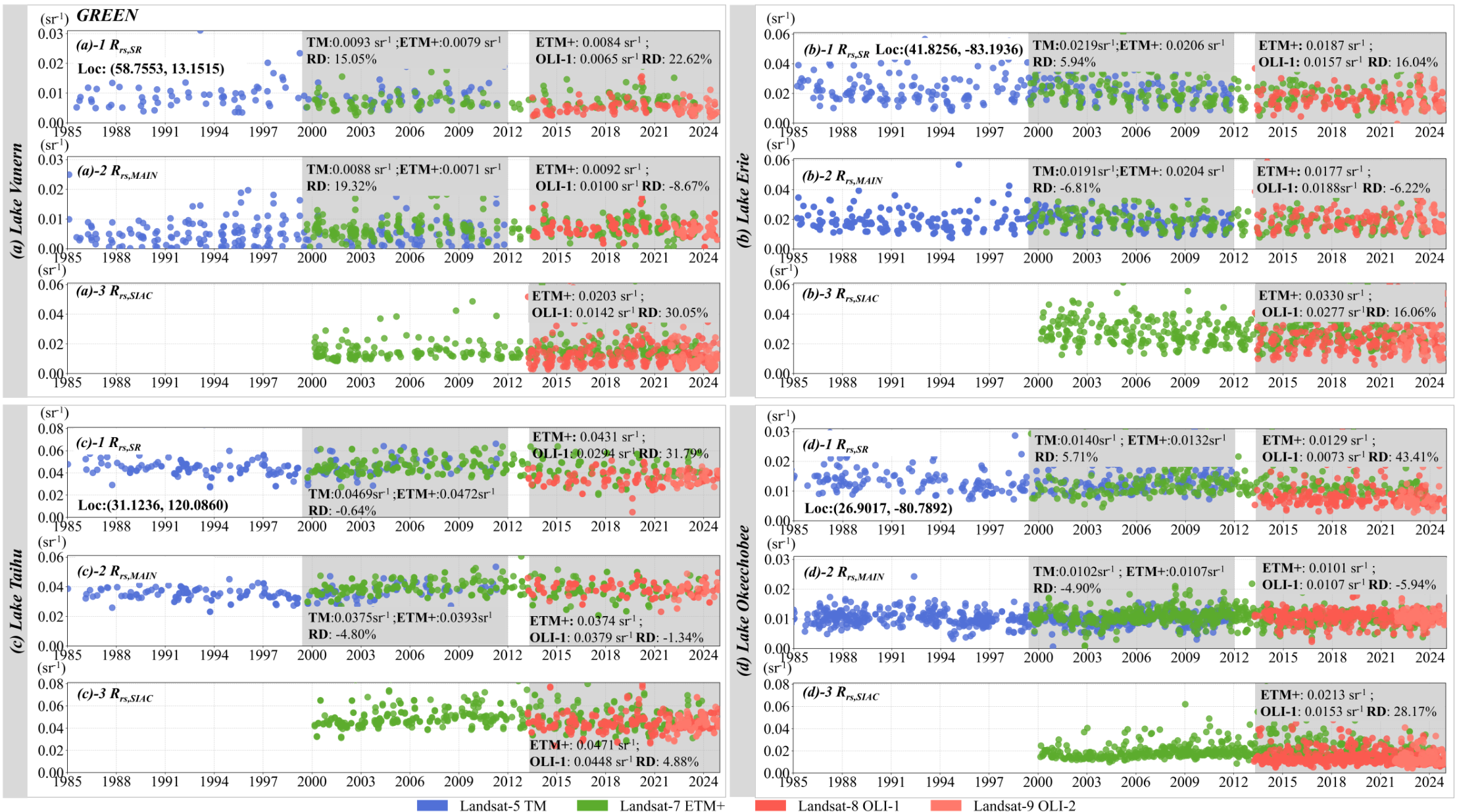 • “历代相机色彩不一”导致数据断层:要分析几十年水环境变化,必须拼接 Landsat‑5/7/8/9 等多代卫星数据。但研究发现,由于不同“相机”的硬件及算法差异,它们对同一水体的观测值存在显著偏差。这种“色彩不统一”让长时序水质变化分析充满不确定性。