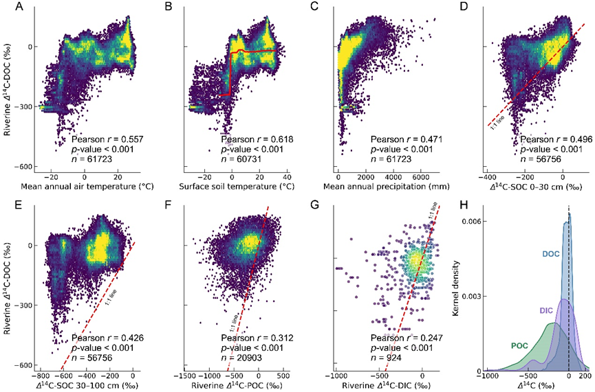 Δ¹⁴C-DOC结果进一步揭示揭示了河流DOC在时间尺度上的巨大差异,其范围从现代碳到超过2.9万年的古老碳,平均Δ¹⁴C为–22.5‰。其中,最古老的DOC主要来自受冻土和冰川影响的高纬和高海拔地区,而热带湿润区域则以现代碳为主。