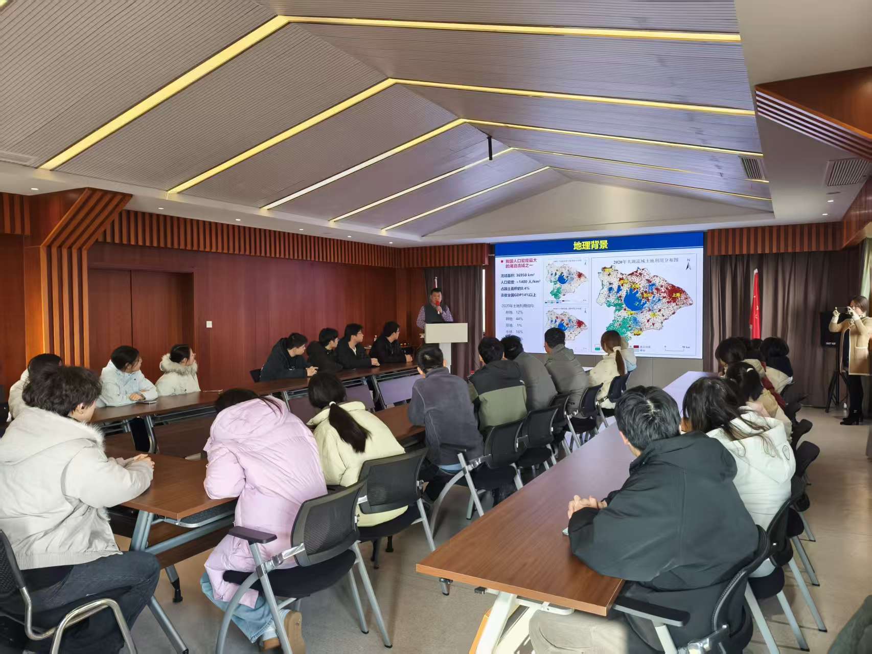 12月6日交流伊始,学子们集中观看了南京地湖所简介视频,直观了解研究所的发展历程与科研布局。随后,蔡永久处长详细介绍了研究所的基本概况、科研方向及重大成果;陈嵘主任围绕研究生培养体系、科研育人特色、学术成长支持等内容深入讲解。安徽师范大学校友、南京地湖所 2023级硕士研究生丁梦瑶结合自身求学经历,生动分享了在地湖所的科研学习、团队协作与个人成长故事,为学弟学妹们提供了贴合实际的学业规划与职业发展参考。