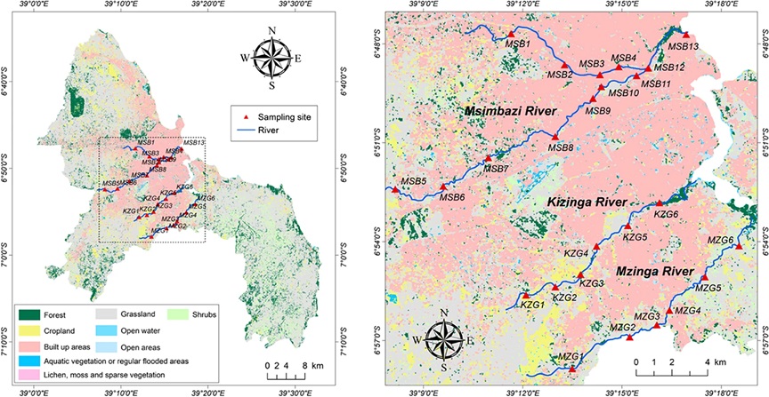 达累斯萨拉姆是印度洋西海岸最大的港口城市,其地表水体主要由全年流经城市的姆津加河、基津加河和姆辛巴齐河三条大河流以及十几条短季节性河流或排水沟组成。并且河流流经农业区、非正式定居点、人口稠密地区、商业和工业区,最终流入印度洋。这些河流的水质对达累斯萨拉姆印度洋沿岸的当地农业和工业生产、人类健康以及环境和生态系统产生重大影响。因此,调查水体理化特征的时空变化,分析其水质退化原因至关重要。