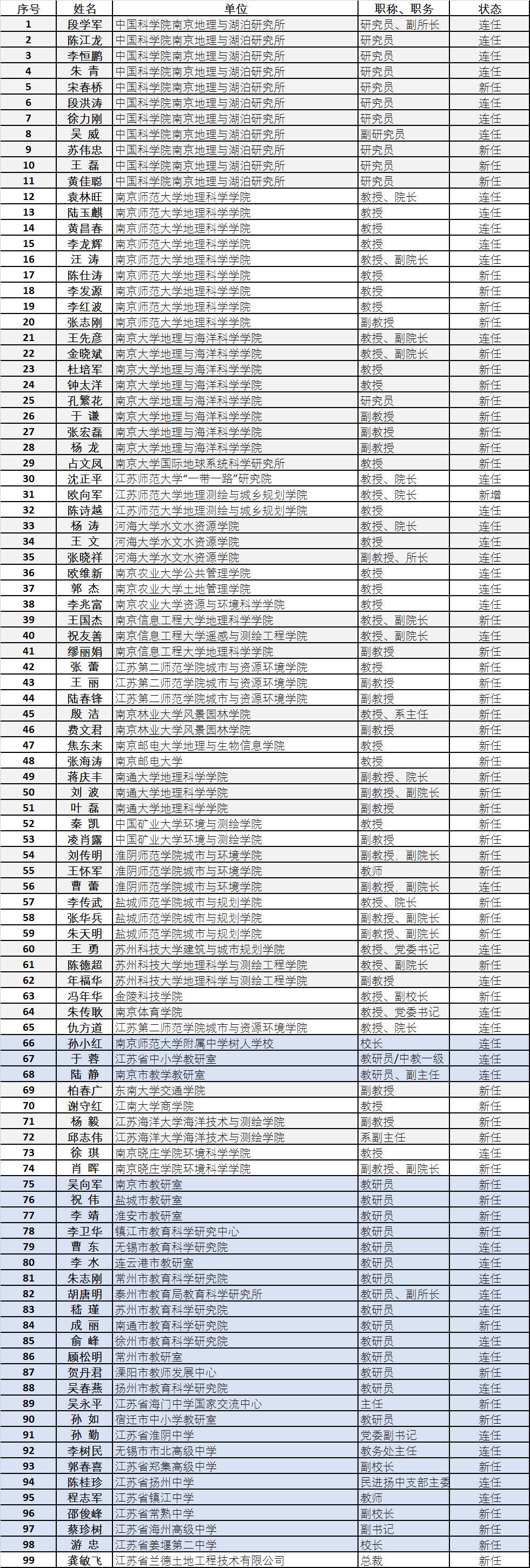 江苏省地理学会第十三届理事会理事名册及监事会名单