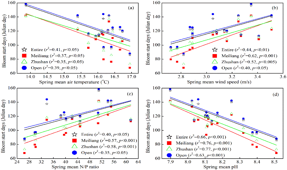 太湖2003-2017年蓝藻水华强度变化及其水华启动时间与环境条件的关系(Shi et al., Environmental Science & Technology, 2019)