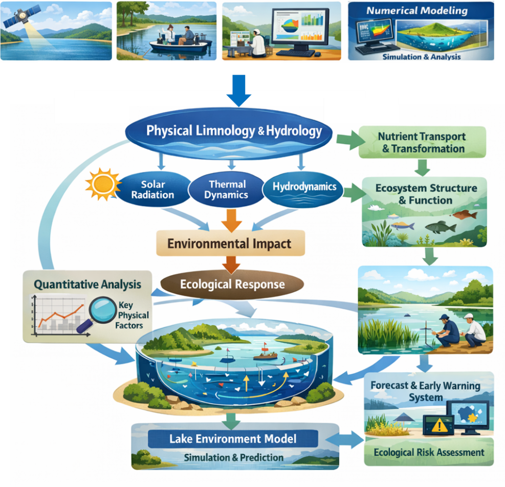 物理湖泊与水文研究室以湖泊光热过程、水动力学机制为核心,聚焦湖泊气象-水文关键物理要素及其生态环境效应的前沿科学问题,通过卫星遥感和野外调查等多尺度观测、实验室及原位试验、高精度数值模型模拟等交叉研究手段,系统阐明湖泊物理环境时空演变对生源要素迁移转化路径、生态系统结构与功能演替的驱动机制,厘清关键物理参数(如水温分层、水动力、光照辐射等)与生态环境的定量响应关系,构建物理要素驱动的湖泊生态环境模型。同时,研究室致力于开发集成遥感监测与模拟技术的湖泊关键生态过程模拟-预测-预警系统,为湖泊生态修复策略的优化调控提供科学支撑。最终,通过理论创新与技术突破,推动物理湖泊学与水文学从基础认知到应用实践的跨越式发展,引领学科前沿方向。