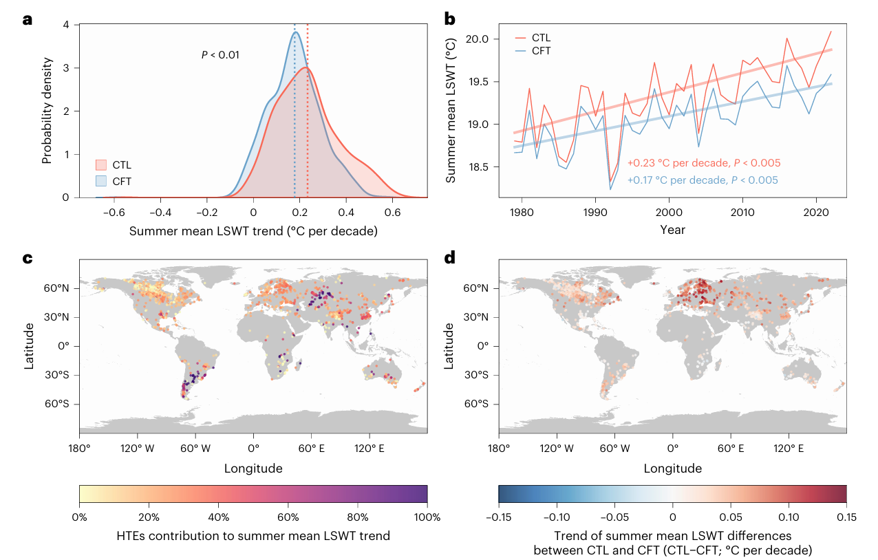 数值试验揭示的大气极端高温事件对夏季湖泊表层水温的贡献成果发表在Nature Climate Change, https://www.nature.com/articles/s41558-024-02122-y