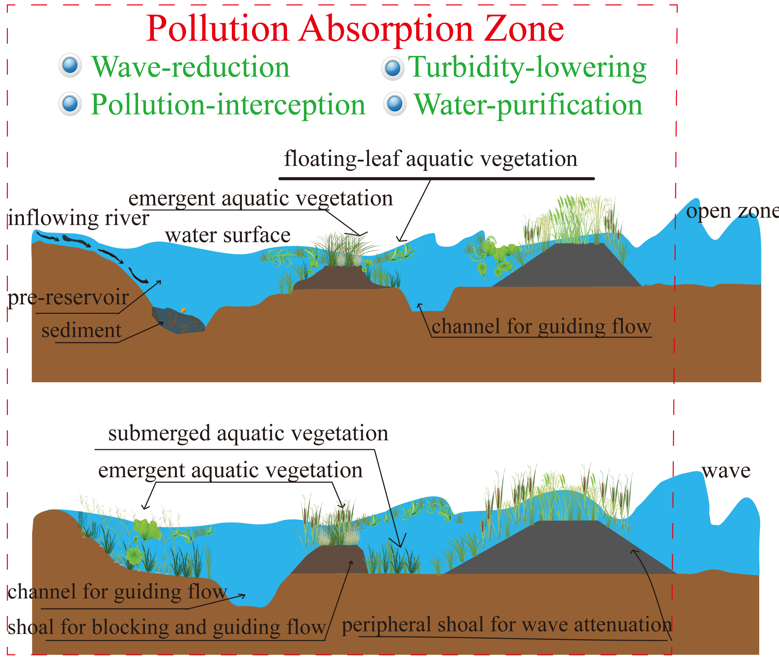 湖泊消纳带布局断面图(上图为入湖口邻近区,下图为典型近岸区)(成果发表在Environmental Science & Technology上, https://doi.org/10.1021/acs.est.5c06249