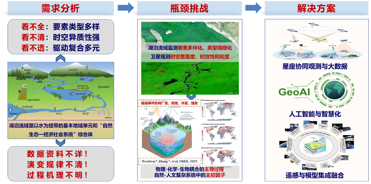 (1)面向湖泊流域系统要素类型多样、时空异质性强和驱动过程复杂等特征,系统开展了湖泊流域智能感知与大数据分析研究 (Nat. Commun., 2023; Sci. Bull., 2023, 2024; Remote Sens. Environ., 2023, 2024, 2025; Water Res., 2025; Geophys. Res. Lett., 2023, 2025) 。