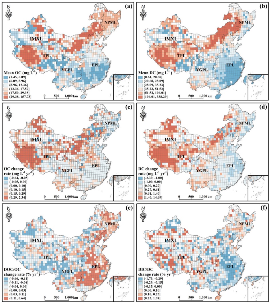 (2)基于全国422个湖泊近8000余站点的现场观测资料和多源卫星星座,重构了全国24,366个湖泊(> 0.01 平方千米)的溶解有机碳(DOC)、颗粒有机碳(POC)和溶解无机碳(DIC)浓度和储量的时空数据集,发现1984-2024年全国湖泊DOC储量增加45%,POC储量增加34%,DIC储量增加36% (Liu et al., Nature Communications, 2024; Yan et al., Scientific Data, 2025)。