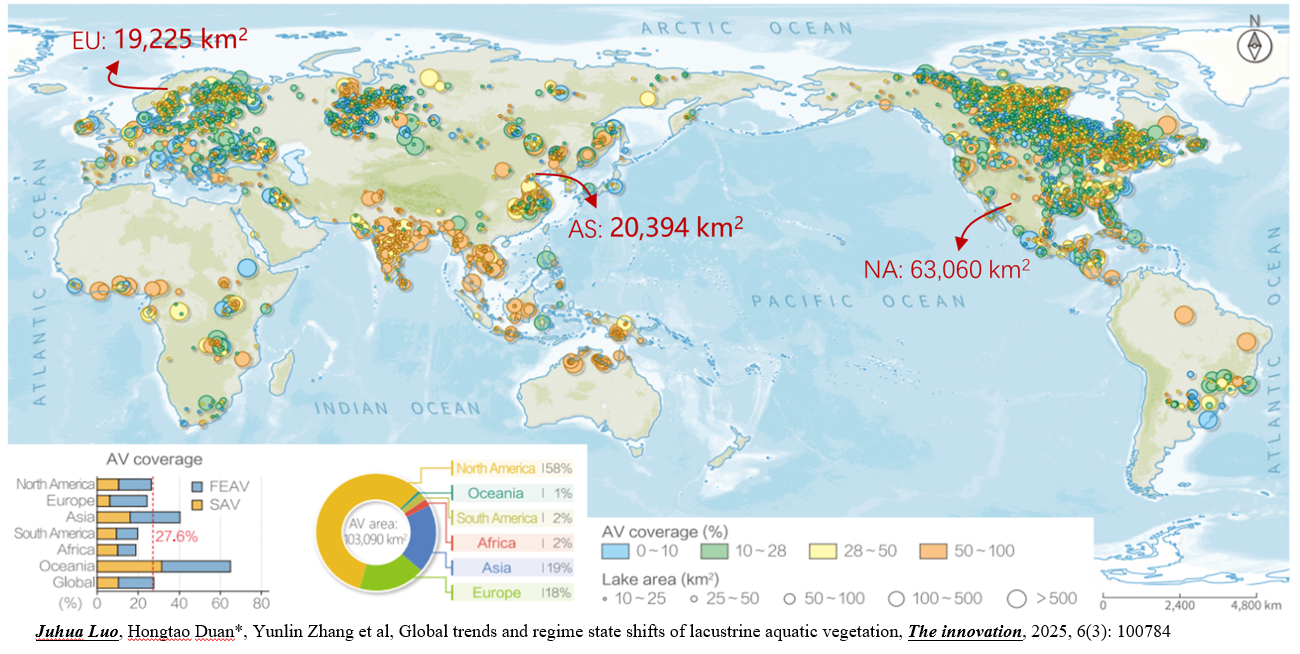 (3)基于多源卫星数据,使用机器学习、深度学习模型,开发了虚拟星座的关键湖泊水环境参数的联合反演框架,实现了区域到全国的湖泊水环境参数智能反演(Xue et al., RSE, 2025; Hu et al., JHM, 2024),构建了全球浅水湖泊水生植被群落时空数据集(Luo et al., the Innovation, 2025)。
