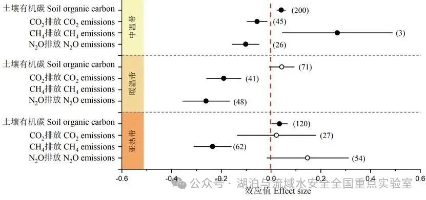 图3. 免耕对我国不同气候带农田土壤有机碳含量和温室气体排放的总体影响