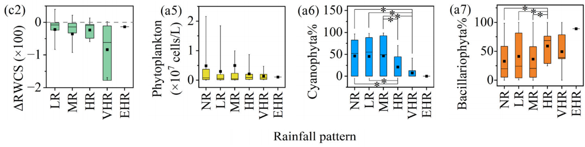 图1. 不同降雨模式对千岛湖街口站水体稳定度(RWCS)、浮游植物密度、蓝藻和硅藻占比的影响(2017–2020年)。LR:小雨(0–10 mm);MR:中雨(10–25 mm);HR:大雨:(25–50 mm);VHR:暴雨(50–100 mm);HER:大暴雨(>100 mm)