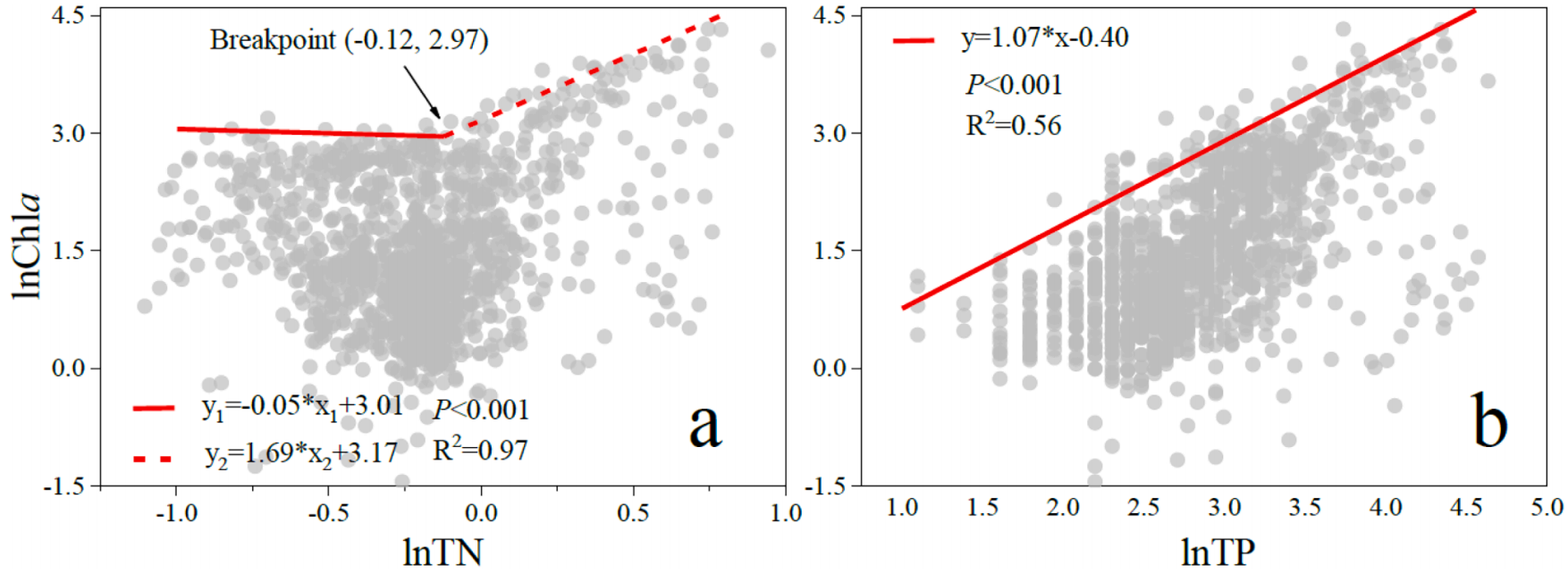 图3. 散点图和约束线揭示千岛湖养分(lnTN mg/L和lnTP μg/L)与lnChla μg/L之间的关系