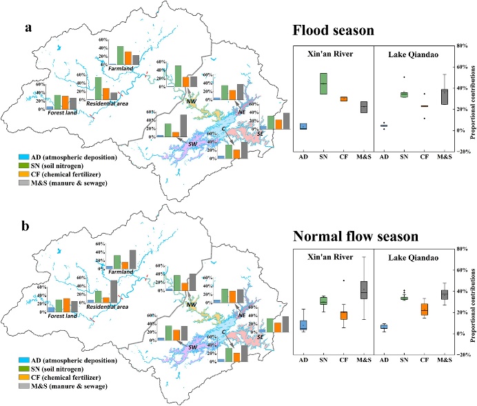 团队基于硝酸盐氮氧双同位素指纹溯源技术与贝叶斯混合模型(SIAR),解析了不同水文情境下的流域氮污染源贡献格局,揭示了极端洪水事件对污染源结构的动态调控效应。在常态水文期,千岛湖流域以农业面源污染为主;但在极端洪水期,洪水扮演了 “污染源切换器” 的角色,显著改变了氮输入格局。洪水不仅剧烈冲刷坡地和农田,使土壤氮和化肥在新安江上游河流段的贡献率高达74%;更通过支流平时藏污纳垢积累的污染物冲刷和污水处理厂超负荷溢流,使生活污水和畜禽废水在千岛湖库体的氮输入贡献跃升至53%,放大了点源污染冲击。这一发现强调,气候极端化条件下,污染源的空间格局与主导类型具有显著的动态可变性,传统基于常年平均的治理策略可能难以应对。