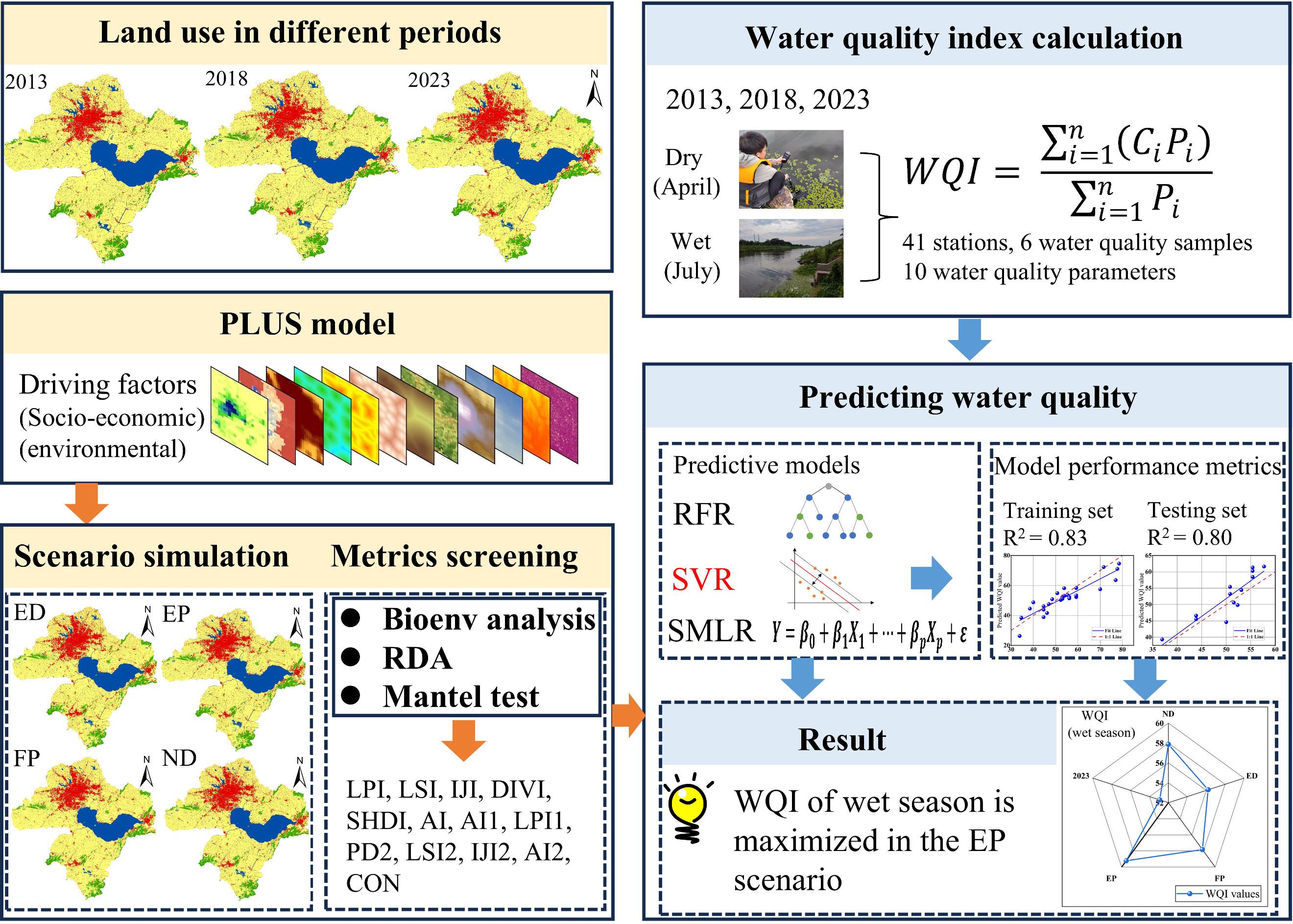 研究结果表明,景观格局对水质的影响在子流域尺度上更为显著,其中建设用地比例和农田破碎化程度是影响水质的关键景观驱动因子。建设用地比例的增加会加剧地表径流与污染物输移;而农田破碎化程度升高则导致养分流失途径增多,促进氮磷等污染物进入河流,从而共同引起水质恶化。在多种预测模型中,支持向量回归在雨季水质预测中表现最优(R2 = 0.80–0.83)(图2)。未来情景模拟结果显示,生态保护情景下流域整体水质最佳,而经济发展情景下水质下降最为明显,强调了在未来区域发展中持续强化生态保护与土地管理的重要性。研究成果揭示了流域河流水质对景观格局演变的响应机制,为流域生态保护与水环境管理提供了科学依据和决策参考。