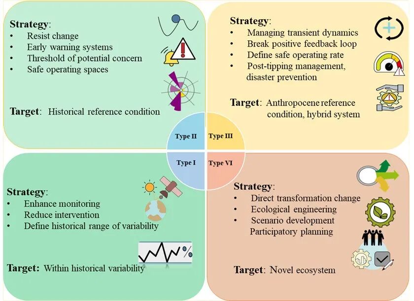 图2. 基于生态状态与变化速率的湖泊类型管理战略框架。不同类型的湖泊需依据其生态状况和环境变化速率采取相应的修复策略,范围从维持历史状态到管理新型生态系统。