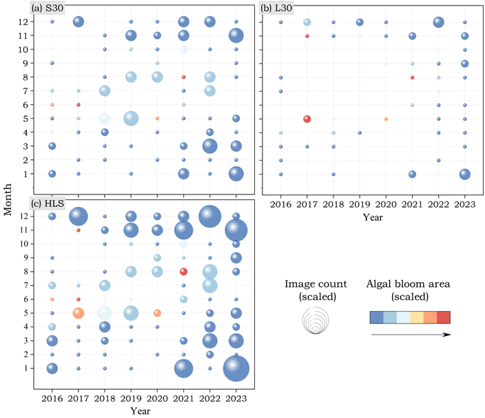 中国科学院南京地理与湖泊研究所张玉超研究员团队,近期利用HLS的L30(Landsat)与S30(Sentinel-2)产品,对我国主要富营养化内陆湖泊的藻类水华开展了长期遥感评估研究,并取得重要进展。