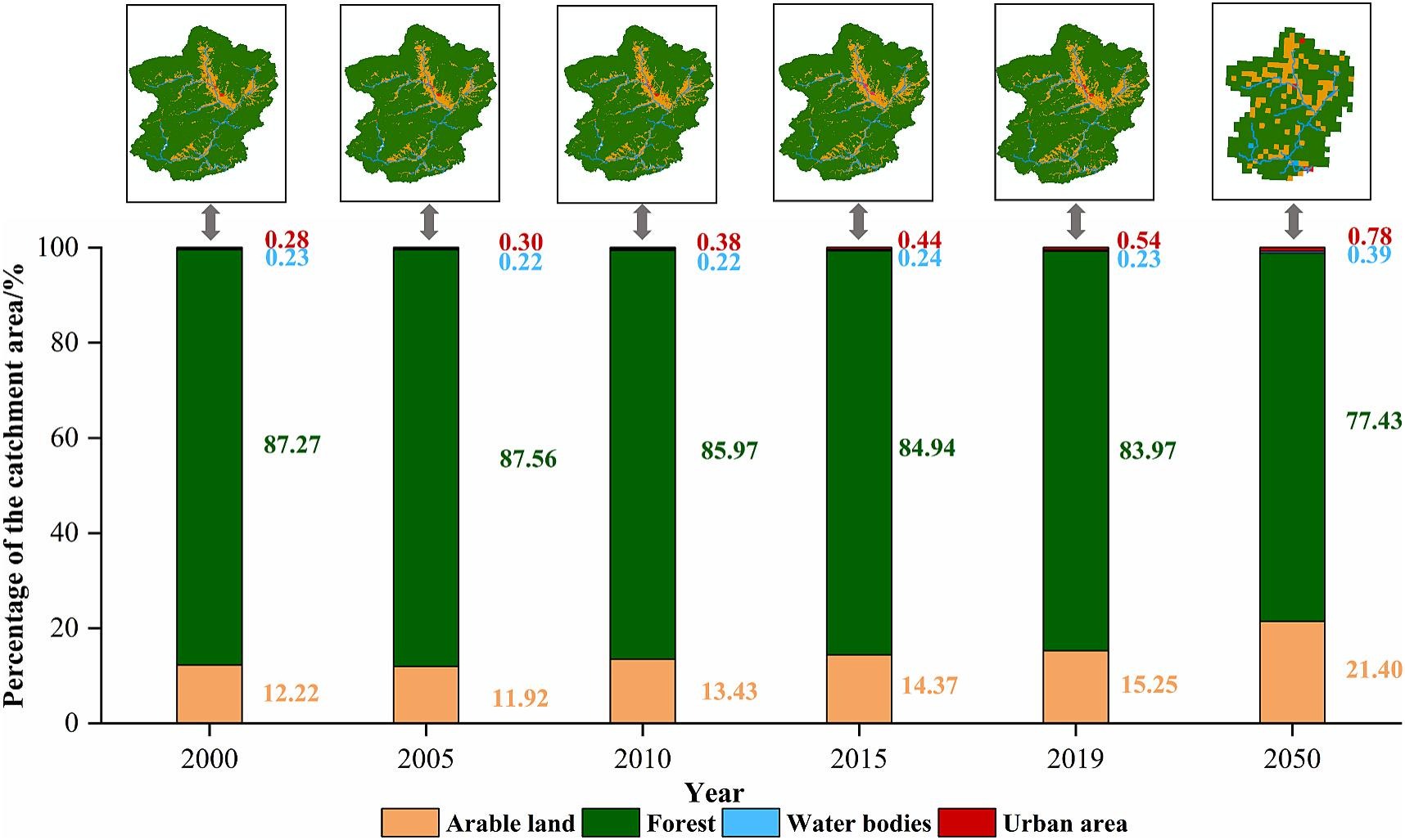 研究结果显示,化肥使用速率、土壤与河网反硝化是无机氮输出季节变化的主要控制因素,春夏季节无机氮素输出负荷高于秋冬季节。流域未来耕地面积增加和林地面积减少将导致河流硝态氮浓度和负荷增加。不同气候变化情景下径流演变趋势存在差异,而河流无机氮浓度将增加。土地利用改变和气候变化综合作用将导致河流无机氮负荷增加。研究表明,气候是径流的主要控制因素,气候变化可能进一步加剧土地利用改变对亚热带流域氮污染的影响。