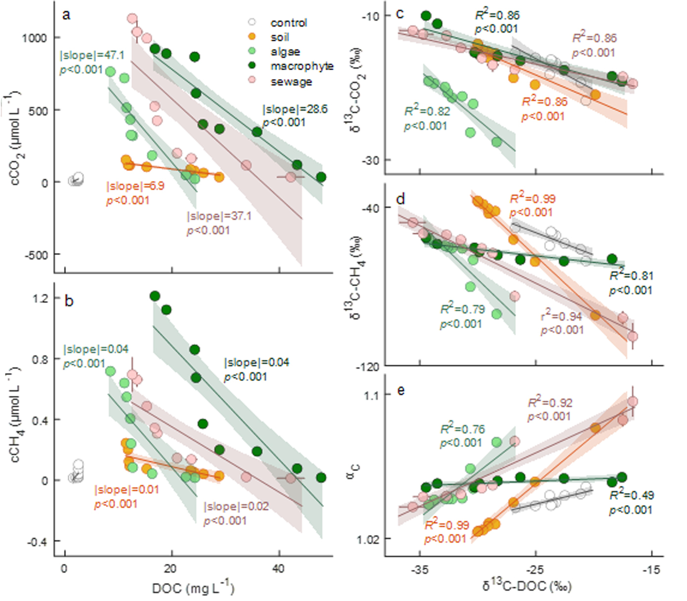 图2. 溶解性有机碳(DOC)的降解与溶解态二氧化碳(cCO2)(a)和甲烷(cCH4)(b)的产生直接相关。不同厌氧生物培养处理组样品中,稳定同位素δ13C-DOC与δ13C-CO2(c)、δ13C-CH4(d)以及碳同位素分馏系数αC(e)之间的关系。所有图中的误差线均表示±1个标准差。