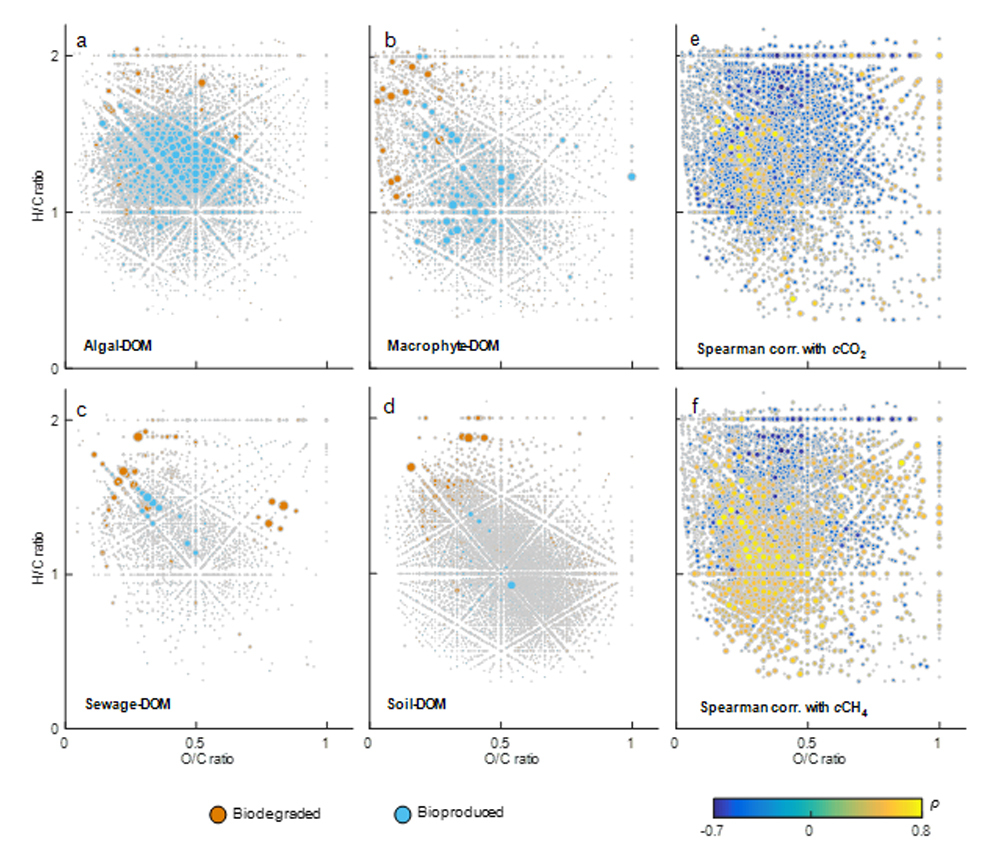 图3. 藻源DOM(a)、水生植物源DOM(b)、污水源DOM(c)和土壤淋溶源DOM(d)的van Krevelen图,以及各分子式相对丰度与溶存CO2浓度(e)和溶存CH4浓度(f)之间的Spearman秩相关。